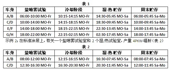 示例1:在5:30-22:30的生產運(yùn)行時間上,有(yǒu)關一個鹽噴霧和4個(gè)濕熱試驗室(表1)每個試驗循環(huán)周期改裝時間大2次15分鍾, 產量8PKW-車身。